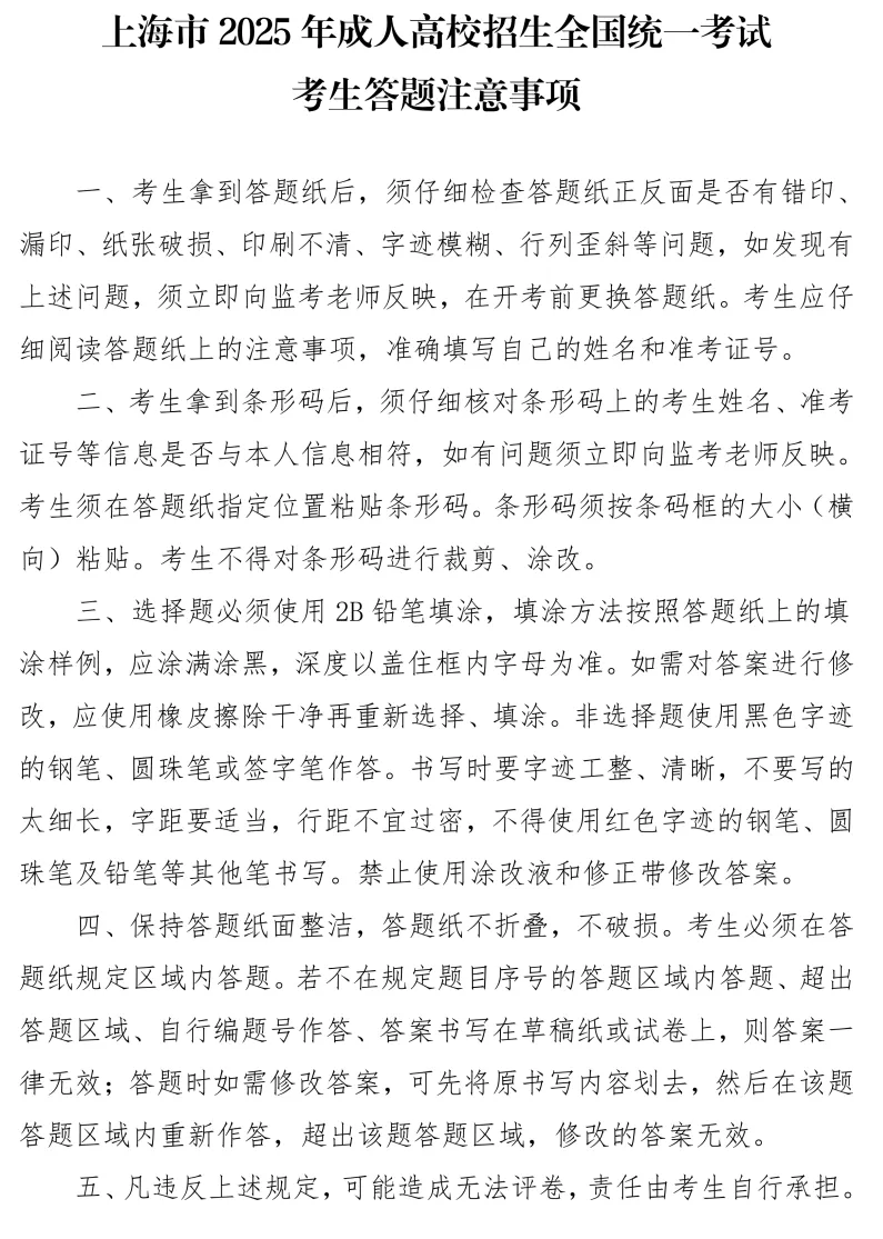 1.请考生本人自行下载打印本次考试准考证。准考证下载网址:https://czbm.shmeea.edu.cn/。下载打印时间:2025年10月11日—10月17日(每天9:00—22:00),10月18日—10月19日(每天7:00—22:00)。考生务必仔细看清准考证上的考试时间、地点和备注等信息,关注考试当天交通及天气情况,合理安排出行时间及路线,提前60分钟到达考点。